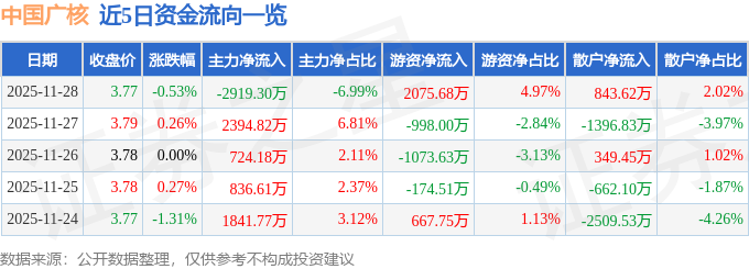 证券之星消息,截至2025年11月28日收盘,中国广核(003816)报收于3.77元,下跌0.53%,换手率0.28%,成交量110.87万手,成交额4.17亿元。