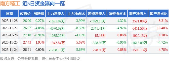 证券之星消息,截至2025年11月28日收盘,南方精工(002553)报收于26.0元,下跌0.27%,换手率6.59%,成交量16.52万手,成交额4.24亿元。