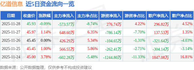 证券之星消息,截至2025年11月28日收盘,亿道信息(001314)报收于45.93元,下跌0.09%,换手率2.76%,成交量1.43万手,成交额6563.29万元。