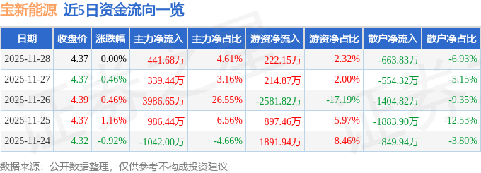 证券之星消息,截至2025年11月28日收盘,宝新能源(000690)报收于4.37元,上涨0.0%,换手率1.01%,成交量21.98万手,成交额9582.03万元。