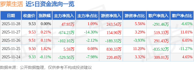 证券之星消息,截至2025年11月28日收盘,罗莱生活(002293)报收于9.53元,上涨0.0%,换手率0.56%,成交量4.62万手,成交额4383.48万元。