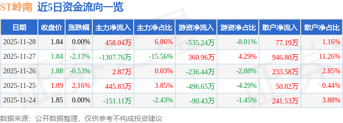 证券之星消息,截至2025年11月28日收盘,ST岭南(002717)报收于1.84元,上涨0.0%,换手率2.24%,成交量36.25万手,成交额6681.83万元。