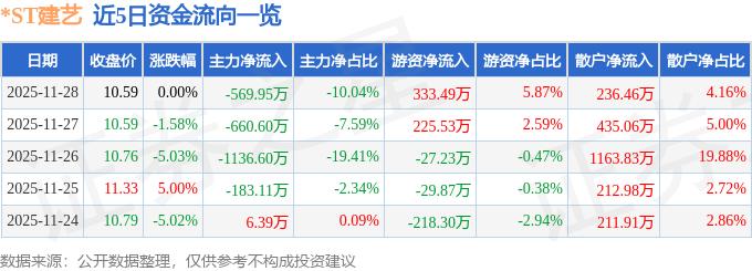 证券之星消息,截至2025年11月28日收盘,*ST建艺(002789)报收于10.59元,上涨0.0%,换手率3.42%,成交量5.35万手,成交额5679.08万元。