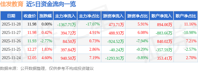 证券之星消息,截至2025年11月28日收盘,佳发教育(300559)报收于11.98元,上涨0.0%,换手率2.16%,成交量6.72万手,成交额8011.85万元。