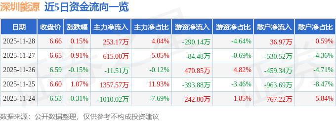 证券之星消息,截至2025年11月28日收盘,深圳能源(000027)报收于6.66元,上涨0.15%,换手率0.2%,成交量9.42万手,成交额6259.2万元。