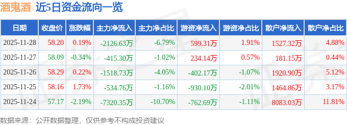 证券之星消息,截至2025年11月28日收盘,酒鬼酒(000799)报收于58.2元,上涨0.19%,换手率1.66%,成交量5.39万手,成交额3.13亿元。