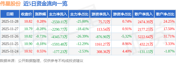 证券之星消息,截至2025年11月28日收盘,伟星股份(002003)报收于10.82元,上涨0.28%,换手率0.94%,成交量9.47万手,成交额1.02亿元。