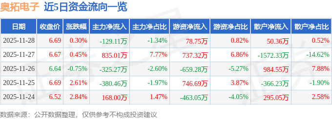 证券之星消息,截至2025年11月28日收盘,奥拓电子(002587)报收于6.69元,上涨0.3%,换手率2.74%,成交量14.43万手,成交额9625.87万元。