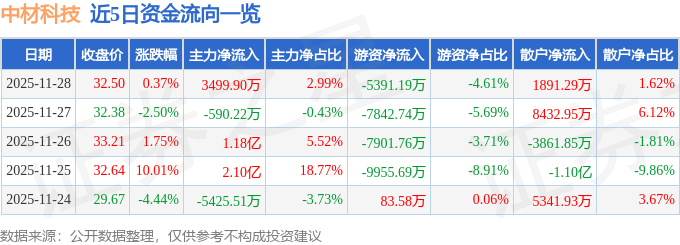 证券之星消息,截至2025年11月28日收盘,中材科技(002080)报收于32.5元,上涨0.37%,换手率2.14%,成交量35.89万手,成交额11.7亿元。