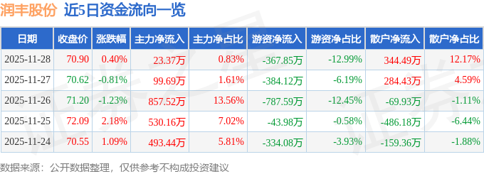 证券之星消息,截至2025年11月28日收盘,润丰股份(301035)报收于70.9元,上涨0.4%,换手率0.14%,成交量4013.0手,成交额2831.33万元。