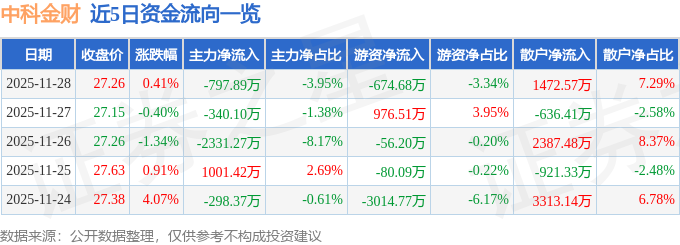 证券之星消息,截至2025年11月28日收盘,中科金财(002657)报收于27.26元,上涨0.41%,换手率2.22%,成交量7.46万手,成交额2.02亿元。