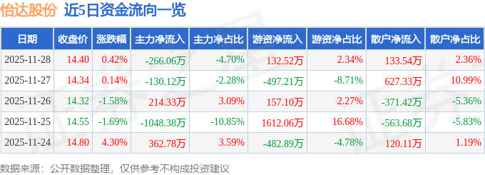 证券之星消息,截至2025年11月28日收盘,怡达股份(300721)报收于14.4元,上涨0.42%,换手率2.85%,成交量3.94万手,成交额5657.28万元。