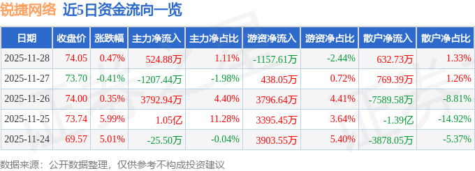 证券之星消息,截至2025年11月28日收盘,锐捷网络(301165)报收于74.05元,上涨0.47%,换手率0.81%,成交量6.42万手,成交额4.74亿元。