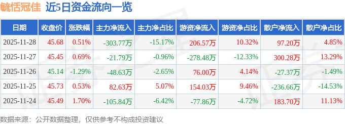 11月28日的资金流向数据方面,主力资金净流出303.77万元,占总成交额15.17%,游资资金净流入206.57万元,占总成交额10.32%,散户资金净流入97.2万元,占总成交额4.85%。