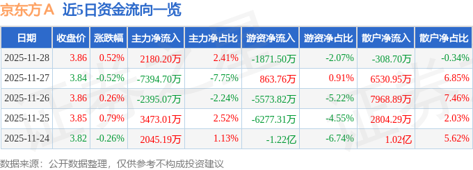 证券之星消息,截至2025年11月28日收盘,京东方A(000725)报收于3.86元,上涨0.52%,换手率0.64%,成交量235.34万手,成交额9.04亿元。