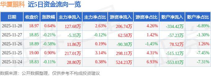 证券之星消息,截至2025年11月28日收盘,华厦眼科(301267)报收于18.97元,上涨0.64%,换手率0.4%,成交量2.57万手,成交额4852.23万元。