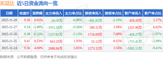 证券之星消息,截至2025年11月28日收盘,实益达(002137)报收于9.3元,上涨0.65%,换手率5.49%,成交量21.77万手,成交额2.02亿元。