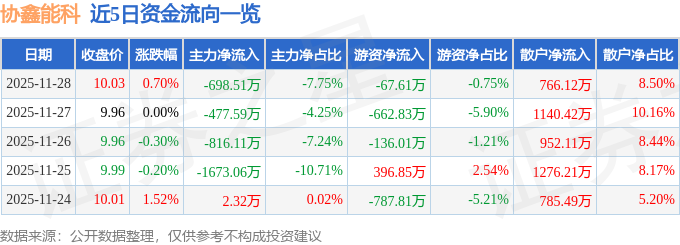 11月28日的资金流向数据方面,主力资金净流出698.51万元,占总成交额7.75%,游资资金净流出67.61万元,占总成交额0.75%,散户资金净流入766.12万元,占总成交额8.5%。