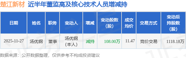 证券之星消息,根据11月28日市场公开信息、上市公司公告及交易所披露数据整理,楚江新材(002171)最新董监高及相关人员股份变动情况:2025年11月27日公司董事汤优钢共减持公司股份108.0万股,占公司总股本为0.0665%。变动期间公司股价下跌0.35%,11月27日当日收盘报11.35元。