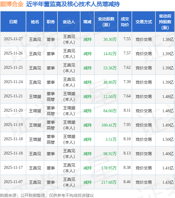 顺博合金近半年内的董监高及核心技术人员增减持详情如下: