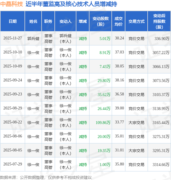 中晶科技近半年内的董监高及核心技术人员增减持详情如下: