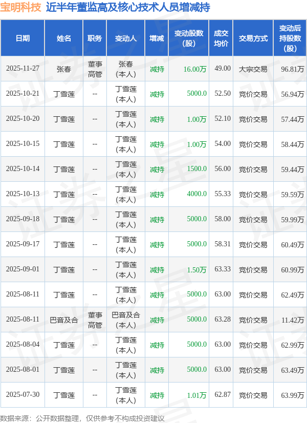 宝明科技近半年内的董监高及核心技术人员增减持详情如下: