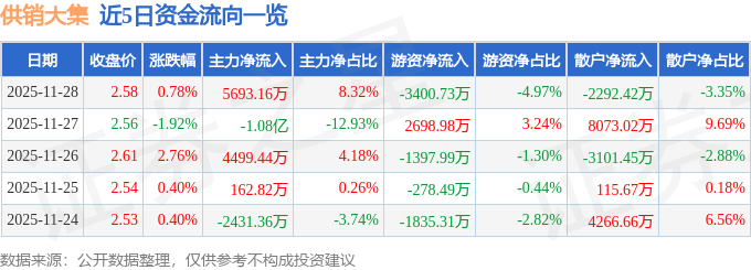 11月28日的资金流向数据方面,主力资金净流入5693.16万元,占总成交额8.32%,游资资金净流出3400.73万元,占总成交额4.97%,散户资金净流出2292.42万元,占总成交额3.35%。