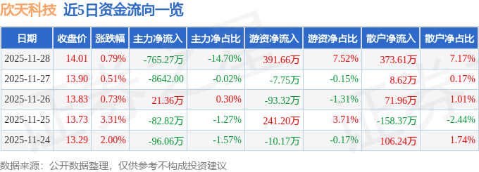 证券之星消息,截至2025年11月28日收盘,欣天科技(300615)报收于14.01元,上涨0.79%,换手率2.99%,成交量3.74万手,成交额5207.64万元。