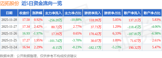证券之星消息,截至2025年11月28日收盘,迈拓股份(301006)报收于17.5元,上涨0.92%,换手率1.58%,成交量1.36万手,成交额2355.06万元。