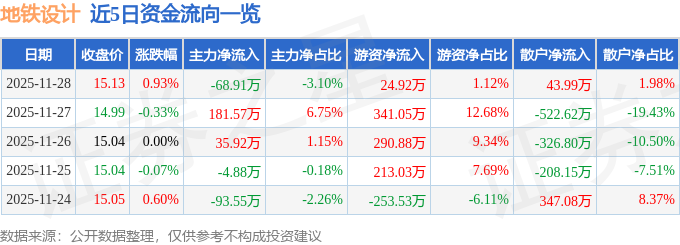 证券之星消息,截至2025年11月28日收盘,地铁设计(003013)报收于15.13元,上涨0.93%,换手率0.37%,成交量1.48万手,成交额2220.99万元。