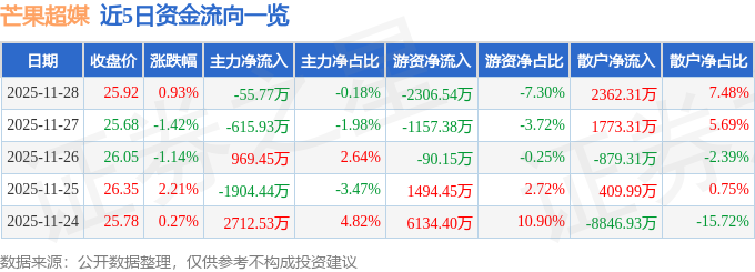 证券之星消息,截至2025年11月28日收盘,芒果超媒(300413)报收于25.92元,上涨0.93%,换手率1.2%,成交量12.27万手,成交额3.16亿元。