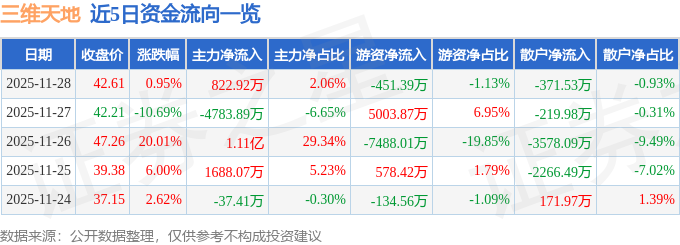 证券之星消息,截至2025年11月28日收盘,三维天地(301159)报收于42.61元,上涨0.95%,换手率18.1%,成交量9.6万手,成交额3.99亿元。
