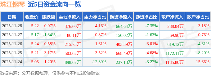 证券之星消息,截至2025年11月28日收盘,珠江钢琴(002678)报收于5.22元,上涨0.97%,换手率1.29%,成交量17.46万手,成交额9044.06万元。
