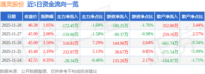 证券之星消息,截至2025年11月28日收盘,通灵股份(301168)报收于46.38元,上涨1.05%,换手率2.34%,成交量2.23万手,成交额1.02亿元。