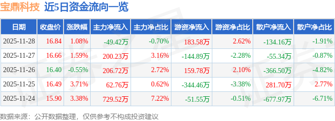 证券之星消息,截至2025年11月28日收盘,宝鼎科技(002552)报收于16.84元,上涨1.08%,换手率1.14%,成交量4.2万手,成交额7013.2万元。