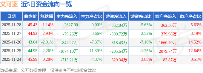 证券之星消息,截至2025年11月28日收盘,艾可蓝(300816)报收于45.43元,上涨1.14%,换手率2.51%,成交量1.42万手,成交额6432.4万元。