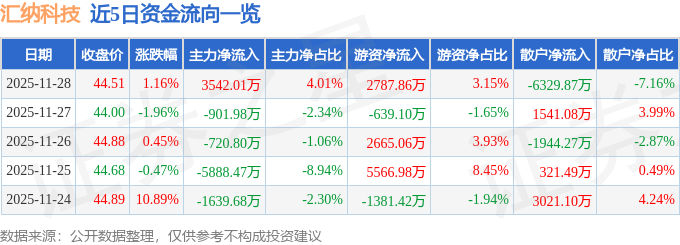 证券之星消息,截至2025年11月28日收盘,汇纳科技(300609)报收于44.51元,上涨1.16%,换手率15.88%,成交量19.05万手,成交额8.84亿元。