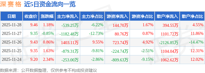 证券之星消息,截至2025年11月28日收盘,深 赛 格(000058)报收于9.46元,上涨1.18%,换手率0.94%,成交量9.23万手,成交额8665.9万元。