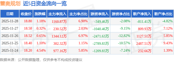 证券之星消息,截至2025年11月28日收盘,蕾奥规划(300989)报收于18.8元,上涨1.18%,换手率5.97%,成交量8.99万手,成交额1.68亿元。