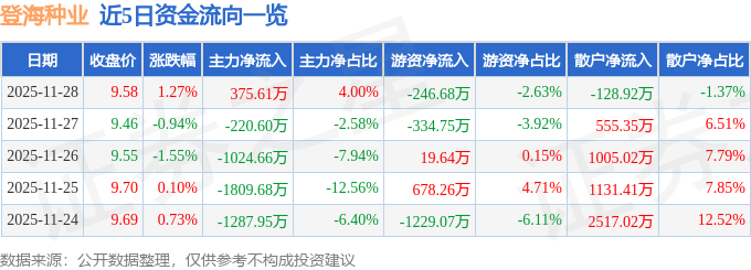 证券之星消息,截至2025年11月28日收盘,登海种业(002041)报收于9.58元,上涨1.27%,换手率1.12%,成交量9.87万手,成交额9380.32万元。