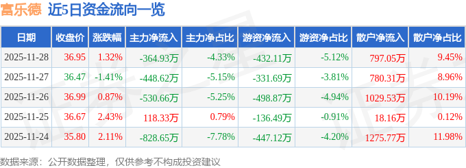 证券之星消息,截至2025年11月28日收盘,富乐德(301297)报收于36.95元,上涨1.32%,换手率1.62%,成交量2.29万手,成交额8431.74万元。