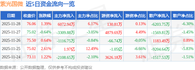 证券之星消息,截至2025年11月28日收盘,紫光国微(002049)报收于76.06元,上涨1.39%,换手率1.53%,成交量13.01万手,成交额9.85亿元。