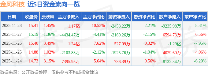 证券之星消息,截至2025年11月28日收盘,金风科技(002202)报收于15.41元,上涨1.45%,换手率2.15%,成交量72.12万手,成交额11.11亿元。
