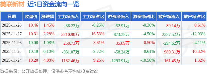 证券之星消息,截至2025年11月28日收盘,美联新材(300586)报收于10.46元,上涨1.45%,换手率2.63%,成交量14.07万手,成交额1.47亿元。