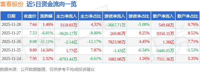 证券之星消息,截至2025年11月28日收盘,富春股份(300299)报收于7.64元,上涨1.46%,换手率13.79%,成交量95.04万手,成交额7.22亿元。