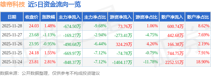 证券之星消息,截至2025年11月28日收盘,雄帝科技(300546)报收于24.03元,上涨1.48%,换手率2.18%,成交量2.92万手,成交额6967.82万元。