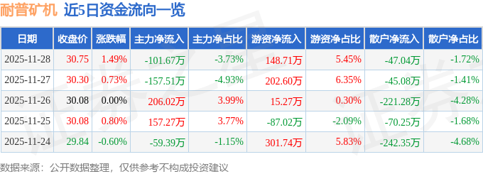 证券之星消息,截至2025年11月28日收盘,耐普矿机(300818)报收于30.75元,上涨1.49%,换手率0.82%,成交量8925.0手,成交额2727.29万元。
