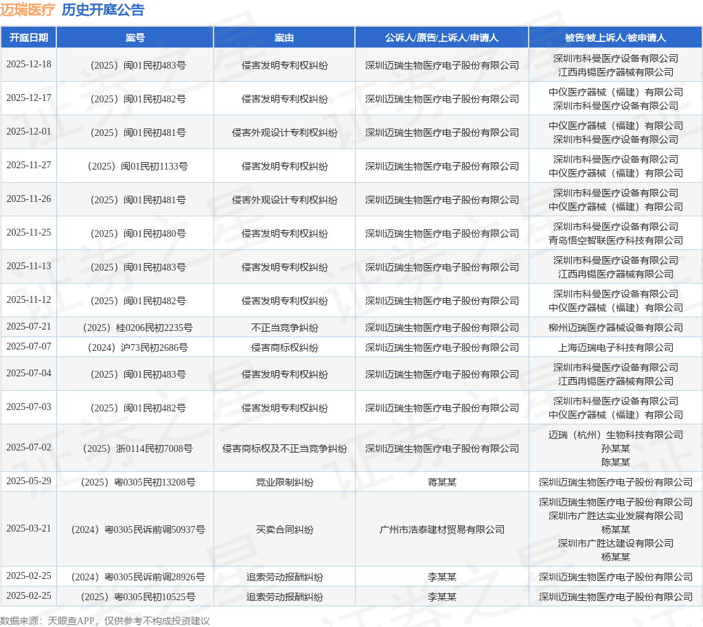 案号:(2025)闽01民初481号根据统计,近一年内以深圳迈瑞生物医疗电子股份有限公司为当事人的历史开庭公告有17则,其中案由为“侵害发明专利权纠纷”的公告以8则居首,其次为“侵害外观设计专利权纠纷”有2则,“追索劳动报酬纠纷”有2则。历史开庭公告如下: