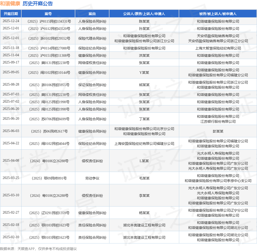 案号:(2025)浙0102民初29552号根据统计,近一年内以和谐健康保险股份有限公司为当事人的历史开庭公告有23则,其中案由为“人身保险合同纠纷”的公告以6则居首,其次为“健康保险合同纠纷”有5则,“责任保险合同纠纷”有3则。历史开庭公告(前20条)如下: