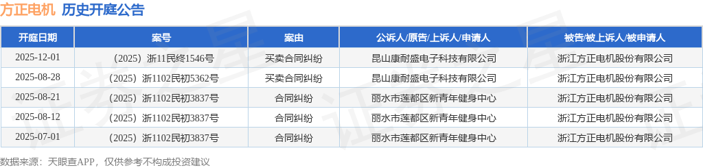 根据统计,近一年内以浙江方正电机股份有限公司为当事人的历史开庭公告有5则,其中案由为“合同纠纷”的公告以3则居首,其次为“买卖合同纠纷”有2则。历史开庭公告如下: